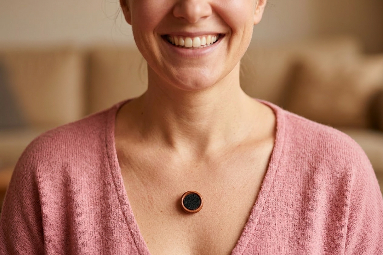 Neşe İyesi, uçucu yağların ciltle doğrudan temas etmeden, kontrollü salınım prensibiyle solunum yoluyla deneyimlenmesini sağlayan tek kullanımlık giyilebilir aromaterapi rozetidir.